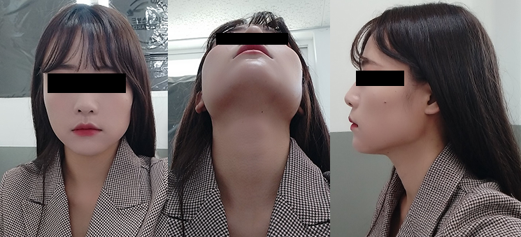 2.CT 혹은 자가진단 사진(=고개를 뒤로 젖치고 턱끝을 들고 턱끝 아랫방향에서 콧등이나 이마를 향한 2~3장 사진 찰영)에서 광대뼈 외곽라인과 턱선 라인을 보았을때